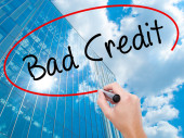 Ręką człowieka pisanie złych kredytów z czarnego markera na wizualne ekranie