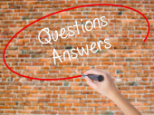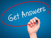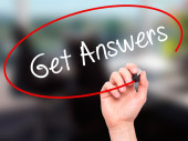Ręka człowieka pisania uzyskać odpowiedzi z czarnym markerem na wizualne ekranie