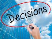 Ręką człowieka piśmie decyzje z czarnym markerem na wizualne ekranie