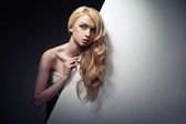 blond kobieta w romantycznej pozie z białą spódnicę