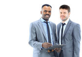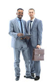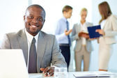szczęśliwy african-american biznesmen z jego zespół pracuje za
