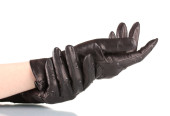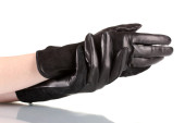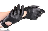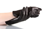 Kobiet w ręce w czarne skórzane rękawice na białym tle