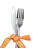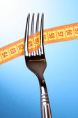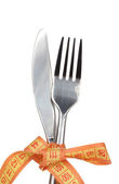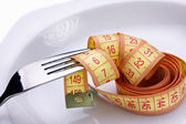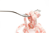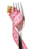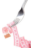 widelec i Miara zwijana w ręku i płyta na białym tle