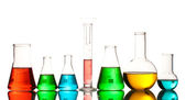 różne Naczynia laboratoryjne z kolor płynu i na białym tle odbicie