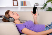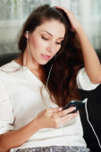 kobieta ze słuchawkami słuchającymi muzyki
