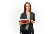 młoda kobieta w marynarkę i bluzka pokazuje arkusz biały, na białym tle