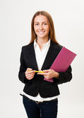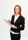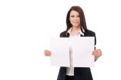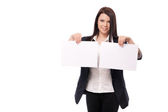 młoda kobieta w marynarkę i bluzka, pokazuje dwa białe prześcieradła, isol