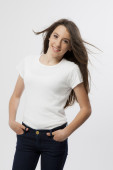 Portret szczęśliwy piękna młoda kobieta z fruwające włosy faliste