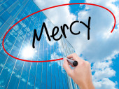 Człowiek w zapasie pismo Miłosierdzia z czarnego markera na wizualne ekranie