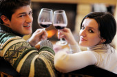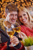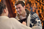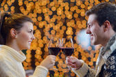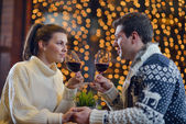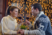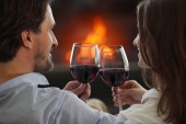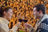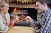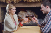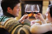 Młoda para romantyczny, siedząc na kanapie przed kominkiem, godz.