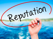 Ręka człowieka pisania reputację z czarnym markerem na wizualne ekranie
