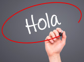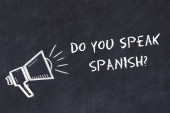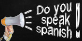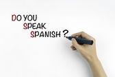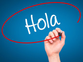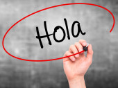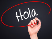 Człowiek w zapasie pismo hiszpański z czarnego markera na wizualne ekranie