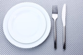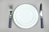 białe puste talerze z widelcem i nożem na szary Obrus