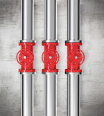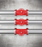 Metalowy rurociąg z żółtymi kranami. Jasnoniebieskie tło.