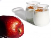 Healthy lifestyle. Useful vitamins food. Proper nutrition. Fruit plate. Apple yogurt diet. Red ripe apples and a cup of yogurt on a wooden table on a light brown background