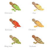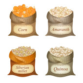Cztery worki związany z fasoli i grochu etykiety na nich