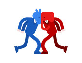 Bear and bull are boxing. Traders fight. Businessmen combat in b