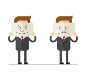 Biznesmen ukryć jego smutny emocje za uśmiechający się paper bag
