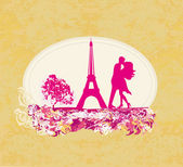 Romantyczna para w Paryżu całuje się w pobliżu karty Eiffla Retro