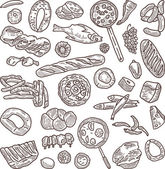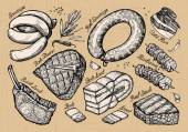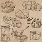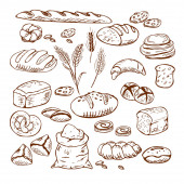 Vintage ręcznie rysowane szkic piekarnia, chleb i ciasta. Ilustracja wektorowa