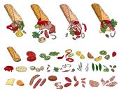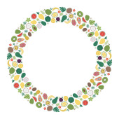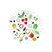 Okrągły szablon z różnymi warzywami, serem i mięsem. Obiekt do projektu, ogłoszenia, tkaniny, karty, plakaty, restauracja i kawiarnia menu.