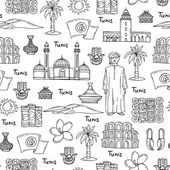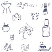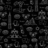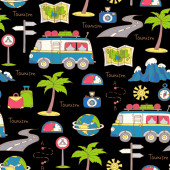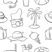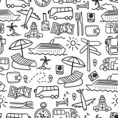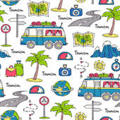 Wektor bezszwowy wzór z ręcznie rysowane na białym tle symbole podróży samochodowej na czarnym kolorze. Wzór na temat turystyki