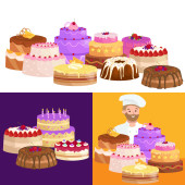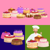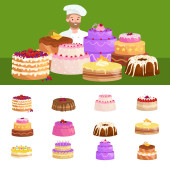 Cukiernik kucharz kucharz postać z kreskówek z ciastem. Zestaw ilustracji wektorowych