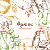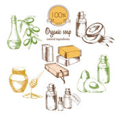 Składniki do tworzenia mydło organiczne. Naturalny produkt. Szkicu odręcznego rysunku w stylu graficznego. Ilustracja wektorowa