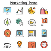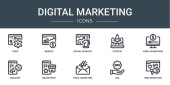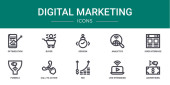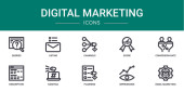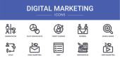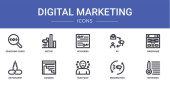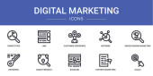 Zestaw w stylu cienka linia ikon Seo & marketingu cyfrowego