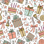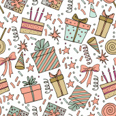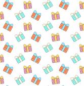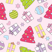 Bezszwowe tło Boże Narodzenie ilustracja z ładny prezent Boże Narodzenie, ozdoby świąteczne i drzewa na niebieskim tle nadaje tapeta, pocztówka i na kartce papieru
