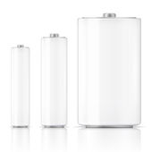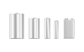 Zestaw biały błyszczący alkaliczne baterie z różnych rozmiar Aaa, Aa, C, D, Pp3 i baterię 9 v na białym tle