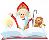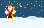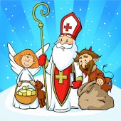 Świętego Mikołaja, diabeł i Anioł w miasteczku - ilustracja wektorowa. W okresie Bożego Narodzenia są ostrzeżenia i karanie złe dzieci i dać dobry dzieciom prezenty.