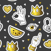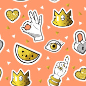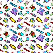 Zdjęcie "Bezszwowe komiks stylu mody tło z deskorolka, słuchawki i znak pokoju. Wektor wzór Retro" może być wykorzystywane do celów osobistych i komercyjnych zgodnie z warunkami zakupionej licencji Royalty-free. Obraz jest dostępny do pobrania w jakości wysokiej rozdzielczości do 5760x3840.