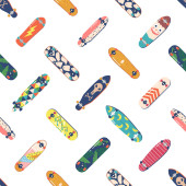 Bezszwowe komiks stylu mody tło z deskorolka, słuchawki i znak pokoju. Wektor wzór Retro