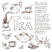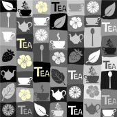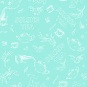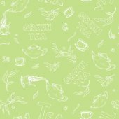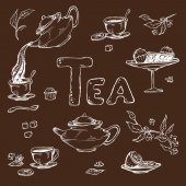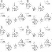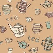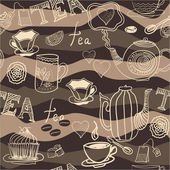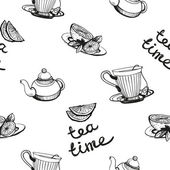 wektor wzór na tle szkicu elementów dla tea party. Czajnik i filiżanki, cukierki, cytryna, spodek