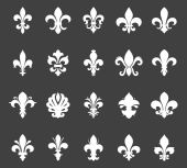 Zbiór w obiekcie fleur de lis symbole, czarne sylwetki - symbole heraldyczne. Ilustracja wektorowa. Średniowieczne znaki. Świecące francuskiego fleur de lis royal lily. Elegancki wystrój symboli.