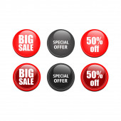 Zestaw przycisków błyszczący sprzedaż lub odznaki. Promocji produktu. Wektor.
