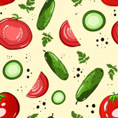 Sałatka jednolity wzór. Pomidor i ogórek niekończące się tło, tekstura. Tło warzywo. Ilustracja wektorowa.