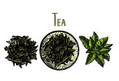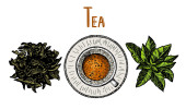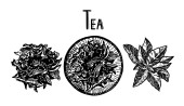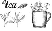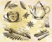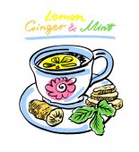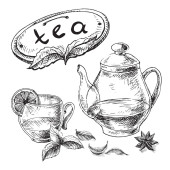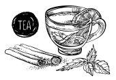 Herbata z cytryna, mięta i cynamon. Wektor ręcznie rysowane graficzny ilustracja.