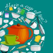 Kuchnia gospodarstwa domowego sztućce filiżanki czyste i białe płytki ceramiczne ułożone. czajnik, kubki talerze w zestaw do herbaty ilustracja wektorowa