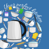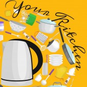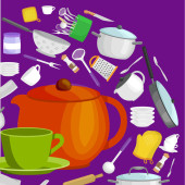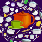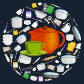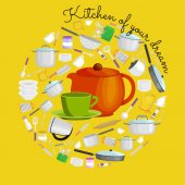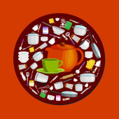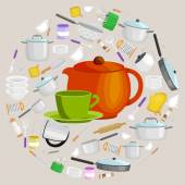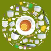 Przybory kuchenne kreskówka zestaw, zbiór teepot pomarańczowy i zielony kubek z talerzyk wektor ilustracja
