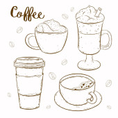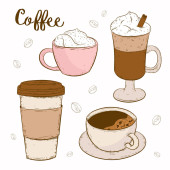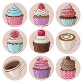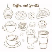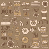 Wektor zestaw z pasty towarów. Pieczone, smaczne jedzenie i kawa.