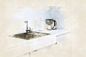 Zdjęcie "Zlewozmywaka. Kuchnia Blat z umywalką. Szkic kuchnia." może być wykorzystywane do celów osobistych i komercyjnych zgodnie z warunkami zakupionej licencji Royalty-free. Obraz jest dostępny do pobrania w jakości wysokiej rozdzielczości do 5760x3840.