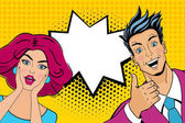 Wow, pop art twarz. Młody zaskoczony człowiek w garniturze, z otwartymi ustami, trzymając lornetki w jego rękach napis wow w refleksji. Ilustracja wektorowa w stylu retro komiks na tle rastra.