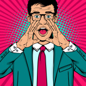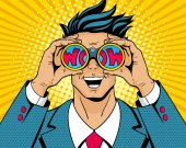 Zdjęcie "Wow, pop art twarz. Młody zaskoczony człowiek w garniturze, z otwartymi ustami, trzymając lornetki w jego rękach napis wow w refleksji. Ilustracja wektorowa w stylu retro komiks na tle rastra." może być wykorzystywane do celów osobistych i komercyjnych zgodnie z warunkami zakupionej licencji Royalty-free. Obraz jest dostępny do pobrania w jakości wysokiej rozdzielczości do 5760x3840.
