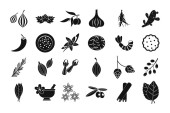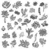 Wektor zestaw przypraw i warzyw. Czerwona cebula, ząbek czosnku, natka pietruszki, tymianek, rozmaryn, gorące Chile, mięta