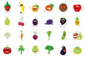 Emotikony żywności wektor zestaw. Ładniutka, zabawne naklejki. Emoji owoców i warzyw stylu cartoon płaski. Ilustracja wektorowa