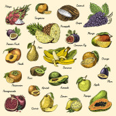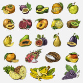 zestaw ręcznie rysowane, grawerowane świeże owoce, wegetariański, rośliny, vintage orange i apple, winogron z orzecha kokosowego, gragonfruit, gruszka, brzoskwinia, śliwka.
