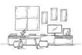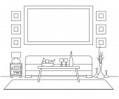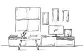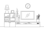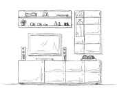 Liniowy szkic wnętrza. Regał na książki, komoda z TV i półkami. Ręcznie rysowane wektor ilustracja stylu szkicu.