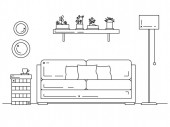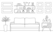 Liniowy szkicu wnętrza. Tabela z okulary i butelkę przed sofą. Ilustracja wektorowa